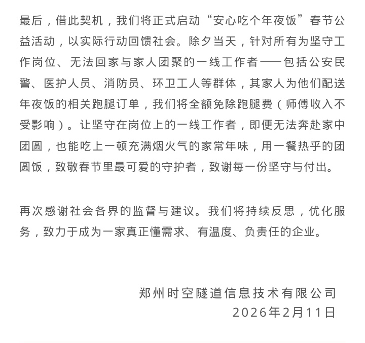 对此,该公司在2月11日的情况说明中表示,推出该服务的初衷是为满足身在异地、行动不便或旅居海外等无法返乡人群的特定需求,希望通过专业服务帮助用户传递牵挂与心意,弥补无法当面问候的遗憾,提供情感慰藉,而非对传统礼仪的亵渎或曲解。