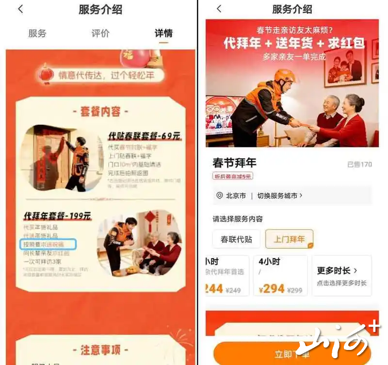 记者检索发现,该项服务于2月7日正式上线,原计划持续至2月24日。据该公司此前在下单小程序中展示的信息,“代拜年帮尽孝”共设三个套餐:套餐一为代贴春联,服务时长1至10小时,价格39元至309元;套餐二为代拜年,服务时长2至10小时,价格199元至599元;套餐三为代磕头,服务时长2至10小时,价格999元至1399元。