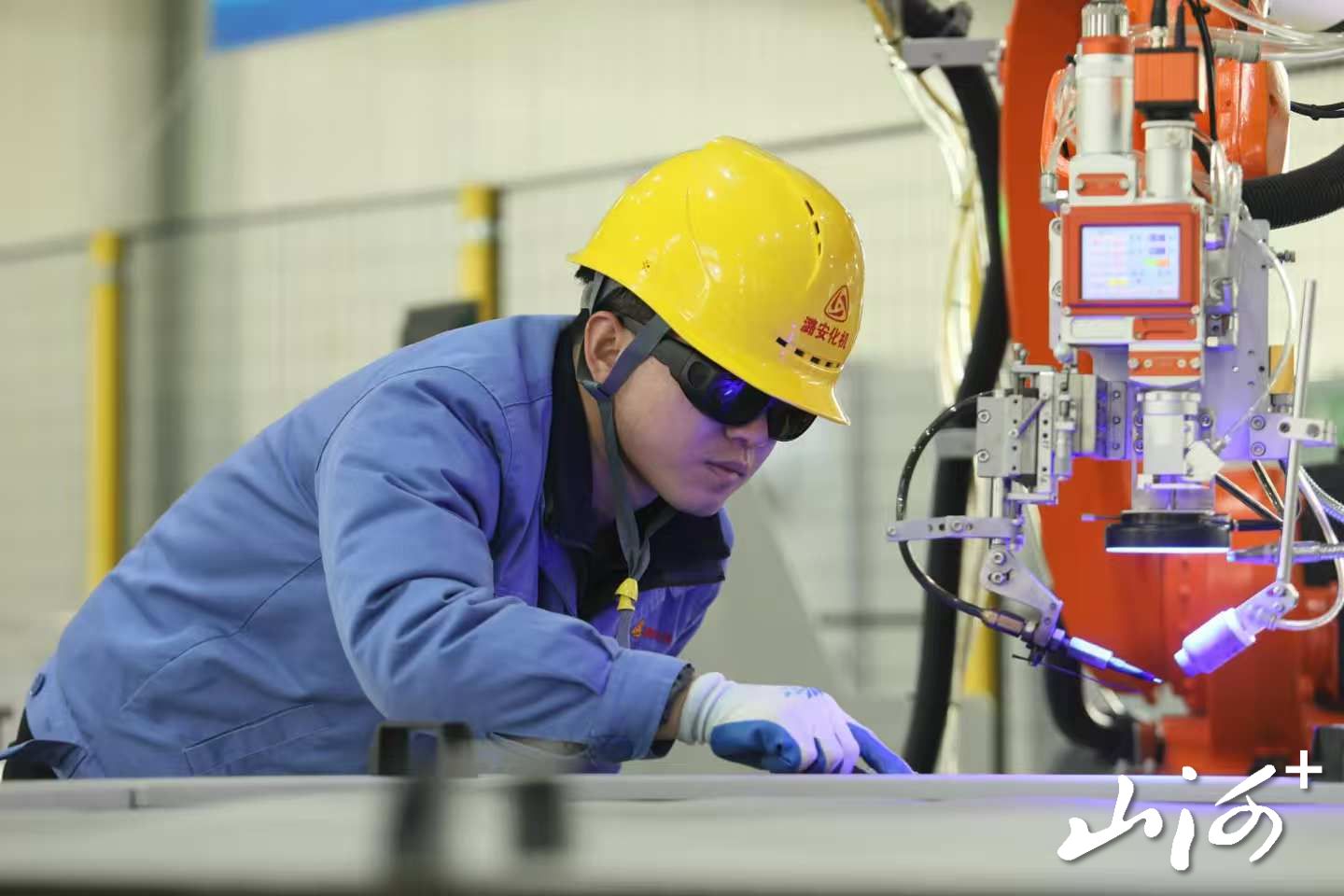 在“晋华槽”智能化焊接生产线上,操作人员正在检查镍网是否处于偏移状态