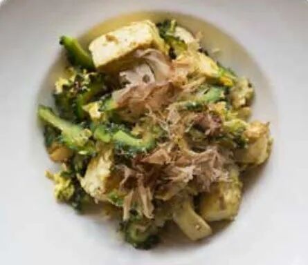 “冲绳料理”之苦瓜杂炒,由蔬菜、豆腐、苦瓜等材料炒制而成,与中国方法相似,“苦瓜杂炒”在炒的时候也要加上鸡蛋