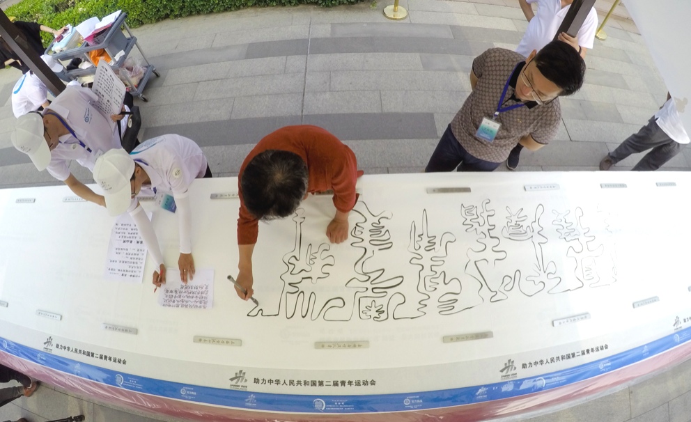 杨拴明独创的“一笔空心字”技艺,他在传承古法的基础上,创造了毛笔笔不离纸、一气呵成的书写技法。2019年6月,他历时15小时20分钟,在面积达814.269平方米的巨幅宣纸上,一笔呵成写下4314字的《毛泽东诗词》长卷,成功创下首项吉尼斯世界纪录。2022年12月,他在黄河壶口瀑布畔以15289幅组合字作品成功挑战第二项吉尼斯世界纪录。