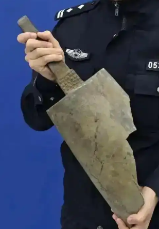 据派出所民警介绍,该物件呈扁体修长状,表面覆盖青绿色锈蚀,隐约可见云雷纹等装饰,造型规整。接报后,警方立即联系市文物局,考古专家现场勘查后确认其文物属性。