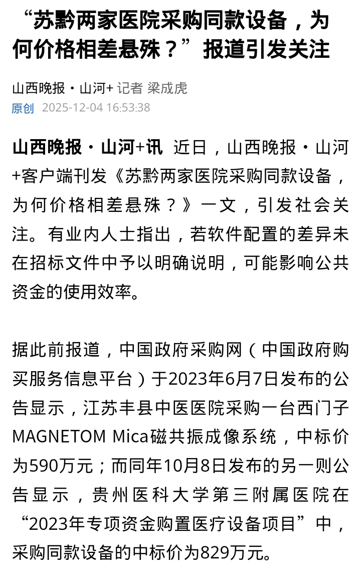 2023年,江苏丰县中医医院与贵州医科大学第三附属医院分别以590万元和829万元采购同型号西门子磁共振设备,价差高达239万元。报道追问差异原因,代理机构称“软件配置不同”,但未提供明细;医院与厂商均回避具体说明。事件引发公众对公开采购透明度、招投标规范性的广泛质疑。同期,多地正开展“倒查十三年”招投标专项整治。11月27日,山西晚报·山河+客户端发表《苏黔两家医院采购同款设备,为何价格相差巨大》,12月发表《“苏黔两家医院采购同款设备,为何价格相差悬殊?”报道引发关注》,对此进行关注。