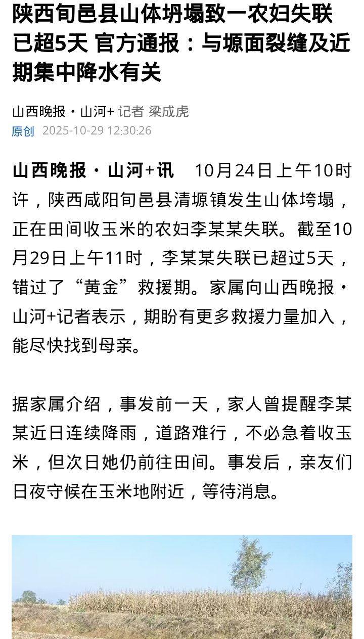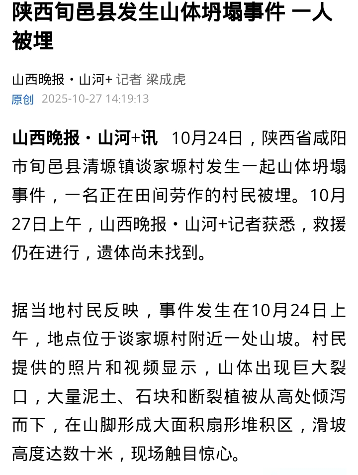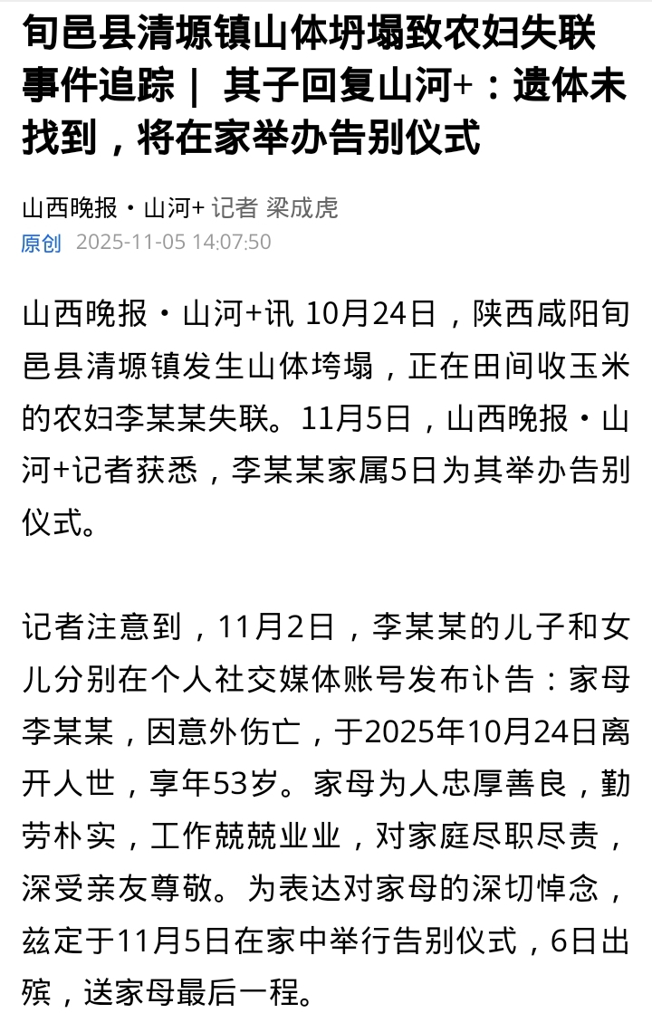 2025年10月24日,陕西旬邑县清塬镇因连续强降雨叠加地下煤矿采空区地质形变,发生山体垮塌,53岁农妇李某某被掩埋失联。尽管政府启动Ⅱ级应急响应,但因滑坡体量巨大、地形险峻,13天后仍未找到遗体,家属被迫在家举行告别仪式。官方通报承认煤矿开采与极端降水是诱因,而涉事煤矿此前已有环保违规和重大隐患记录。10月27日,山西晚报·山河+客户端发表《陕西旬邑县发生山体坍塌事件 一人被埋》,10月29日发表《陕西旬邑县山体坍塌致一农妇失联已超5天 官方通报:与塬面裂缝及近期集中降水有关》,11月5日发表《旬邑县清塬镇山体坍塌致农妇失联事件追踪| 其子回复山河+:遗体未找到,将在家举办告别仪式》,对该事件进行了关注。