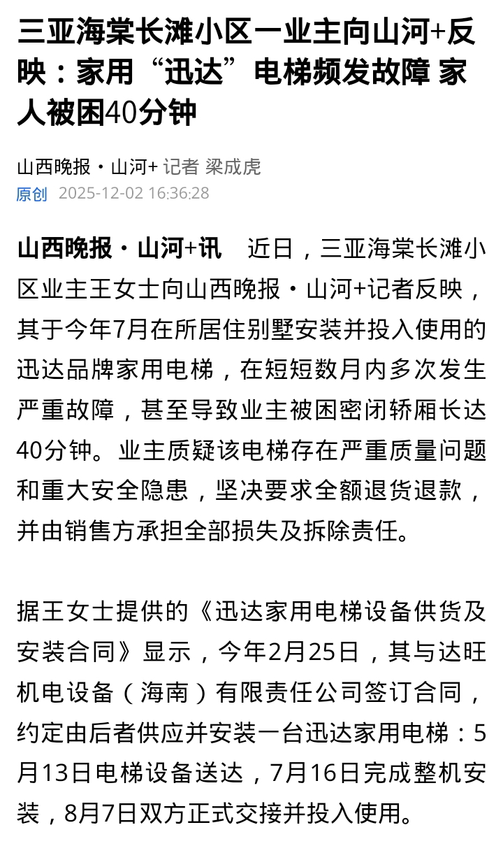 2025年7月,三亚海棠长滩小区业主王女士安装的迅达家用电梯在短短数月内多次故障,11月更发生40分钟密闭困人事件。业主质疑产品质量,要求退货退款并赔偿损失。销售方坚称“大品牌无问题”,售后人员则归因于“钢丝绳自然延长”。12月2日,山西晚报·山河+客户端发表《三亚海棠长滩小区一业主向山河+反映:家用“迅达”电梯频发故障 家人被困40分钟》,文中指出:频繁故障可能源于安装调试或维保缺失,而非单纯自然损耗,并援引《产品质量法》《消费者权益保护法》强调产品应保障基本安全性能。山河观察的报道有效推进了事件解决。