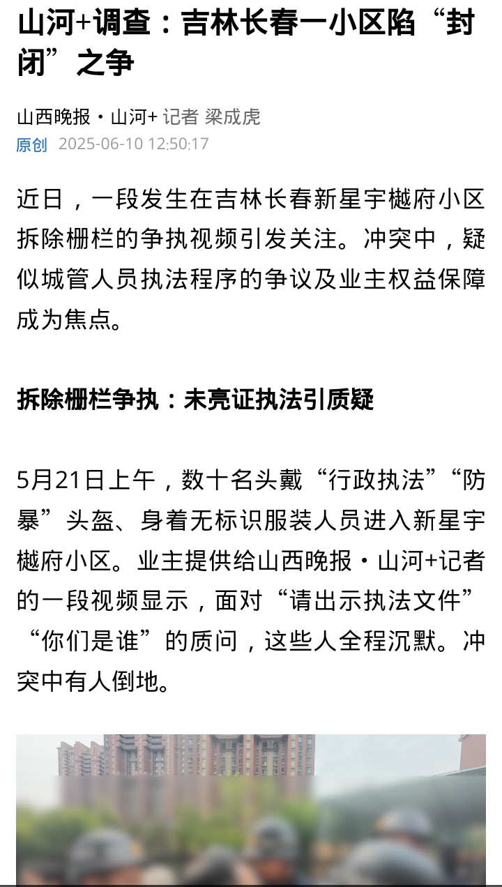 长春新星宇樾府小区因围墙被拆,业主自建栅栏又被强制拆除,引发四年“围墙拉锯战”。2025年5月,无标识执法人员强行拆除栅栏,拒绝出示证件,导致冲突。业主手持备案规划图质疑:当初审批发证为何允许围墙存在?如今又凭何认定违建?物业、街道、城管均未正面回应。6月10日,山西晚报·山河+客户端发表《山河+调查:吉林长春一小区陷“封闭”之争》。