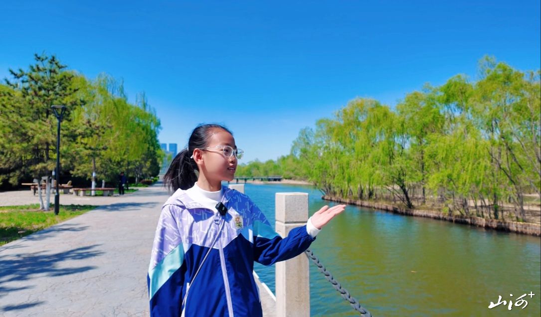 山西晚报小记者张思茹在汾河公园进行主题录制。