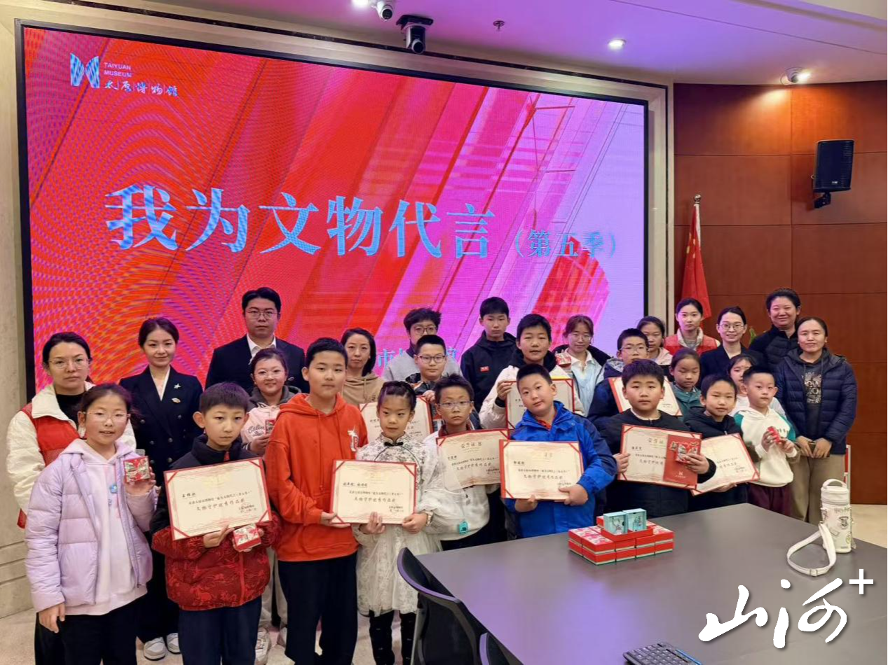 颁奖仪式现场,全体参与者共同观看了太原市博物馆宣传片,全面了解馆内藏品、展陈及公共服务体系。太原市博物馆公众服务部主任侯艳芳向到场观众介绍了馆内品牌社教活动,重点推介展览研学、探访古人、小小讲解员等特色项目,诚邀更多青少年走进博物馆参与文化传播。随后,馆方为十佳优秀作品获得者颁发荣誉证书及文创笔记本、文创钥匙扣等精美礼品,鼓励大家持续关注文物、热爱历史。