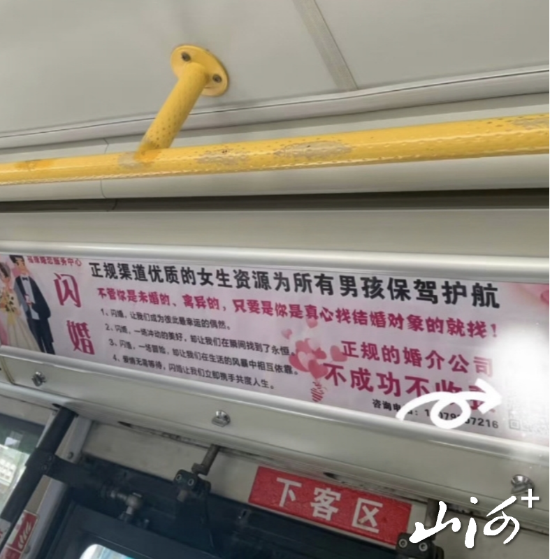 山西晚报·山河+讯 近日,多位网友反映,江西九江市德安县一辆公交车内张贴的婚恋中介广告宣扬“闪婚”,并以醒目字体标注“正规渠道优质的女生资源为所有男孩保驾护航”,引发广泛争议,被质疑物化女性、违背公序良俗。4月9日,山西晚报·山河+记者从德安县交通运输局获悉,当地部分公交车确实曾张贴该广告,目前已全部撤下。