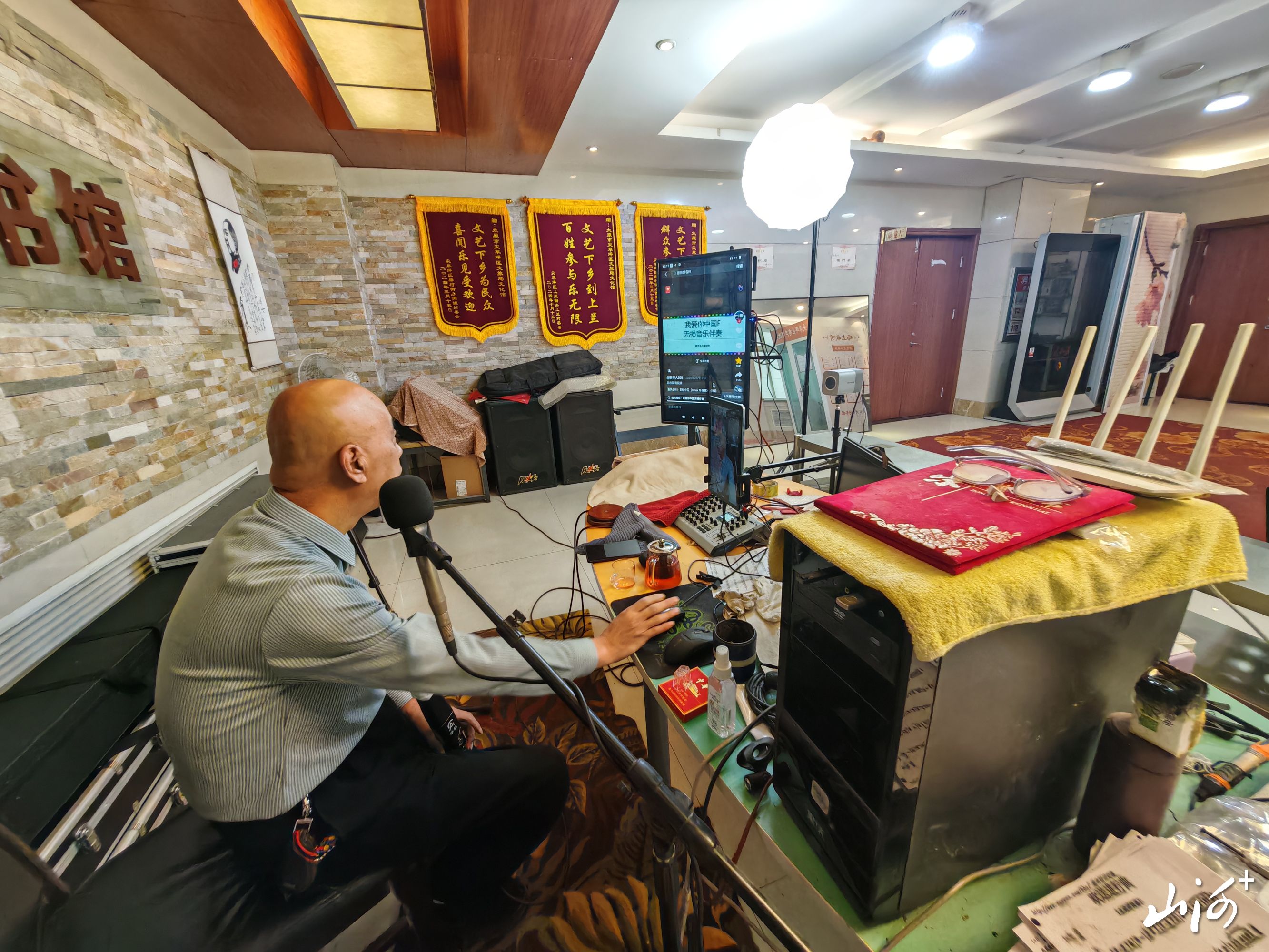 有声墙对面,是一个近30平方米的开放式直播间。工作在同一栋楼里的区文化馆馆员张学成正手持黑管吹奏练习,同时通过对面的数字屏幕与直播间粉丝互动交流。“每天只要忙完工作,我就会抽出10分钟的时间,到楼下这个直播间练练乐器。这个直播间建得太好了,免费不说,设备还很先进,环境也好,既能练习曲子,还能开直播与粉丝交流。”张学成笑着说,自从直播间投入使用以来,他已成为这里的常客。