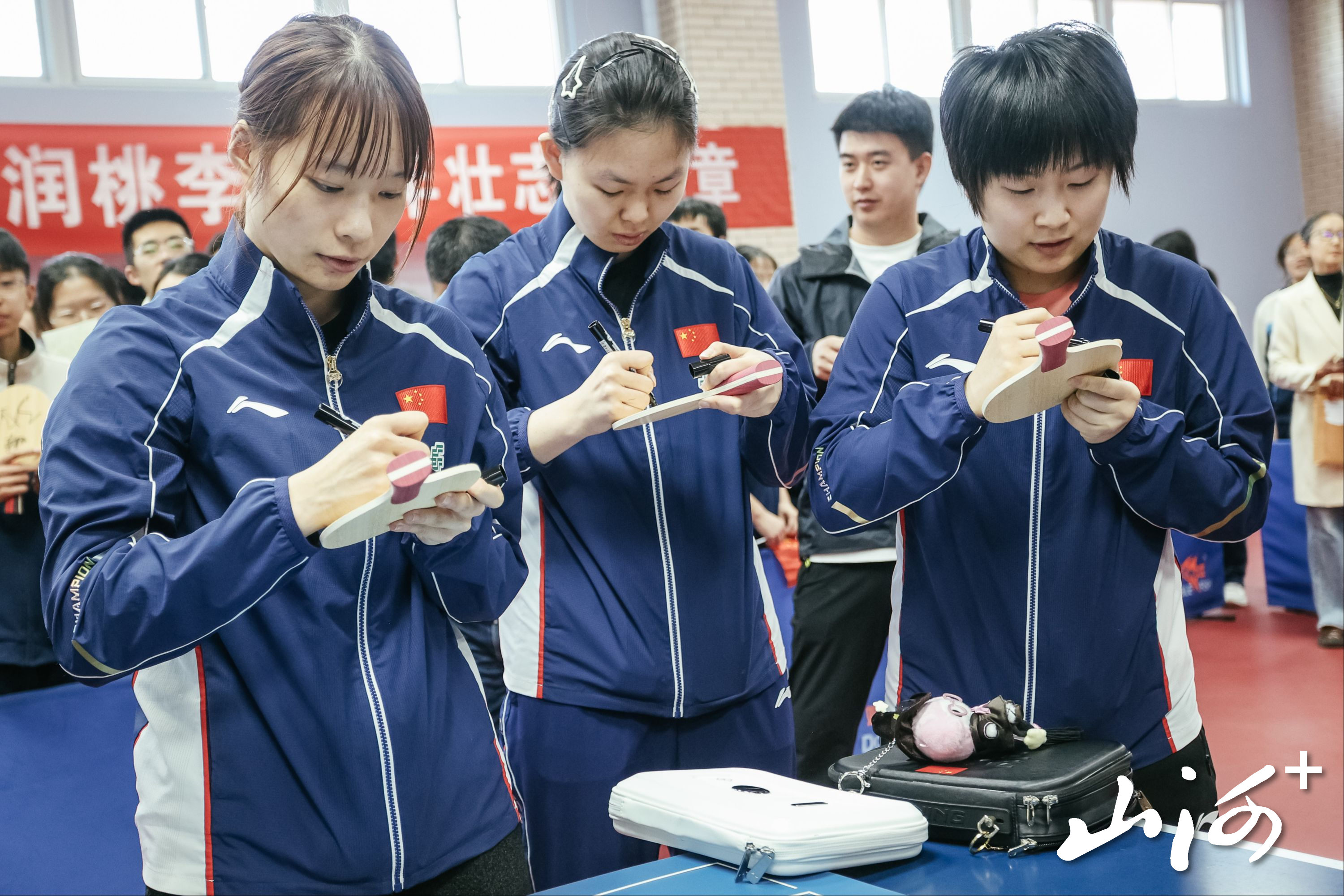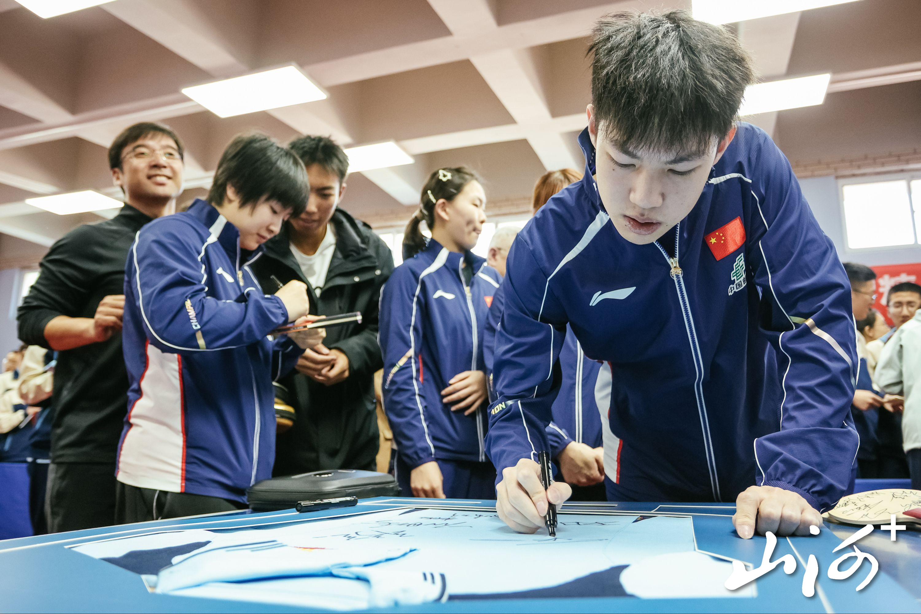 现场,初中生薛景文、孙昊恩与国乒选手搭档,上演了一场精彩的“混双”表演。初二学生王桐卉虽然未能上场,但集齐了6名国乒选手的签名,“看过WTT太原站比赛,今天近距离观看国手打球,收获还是很大的。”作为山大附中乒乓球队成员,王桐卉刚刚随队在小店区中小学生乒乓球比赛中斩获团体冠军。