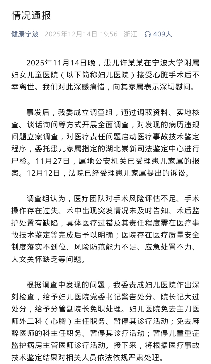 山西晚报·山河+讯 11月18日,山西晚报·山河+客户端刊发《宁波一名5月龄女婴心脏手术后离世 宁波市卫健委深夜通报:彻查》的报道。12月14日,宁波市卫生健康委员会再次发布情况通报,对事件调查进展及处理结果予以说明:医院分管副院长被免职,院党委书记受到警告处分,院长被记大过处分。