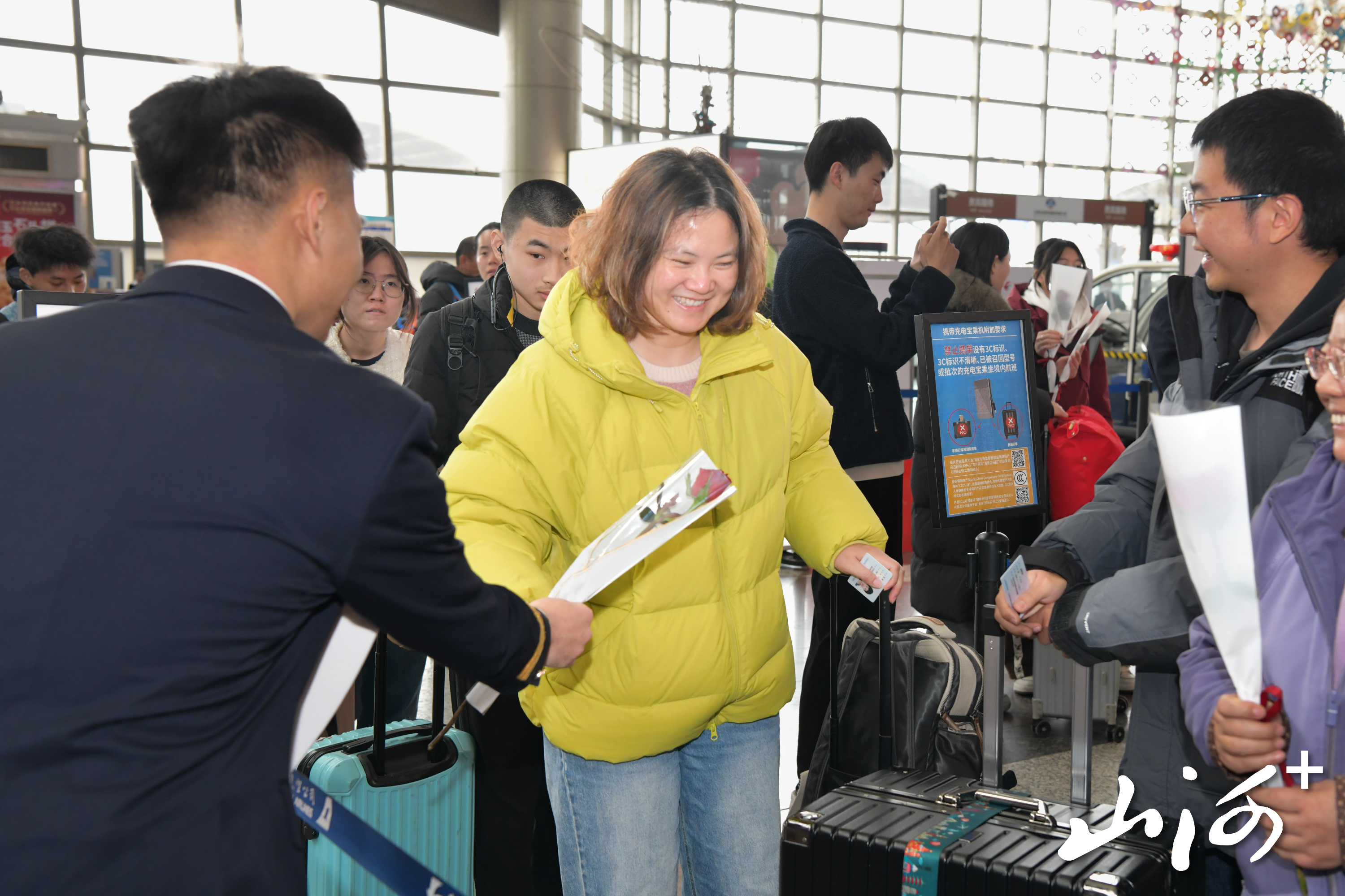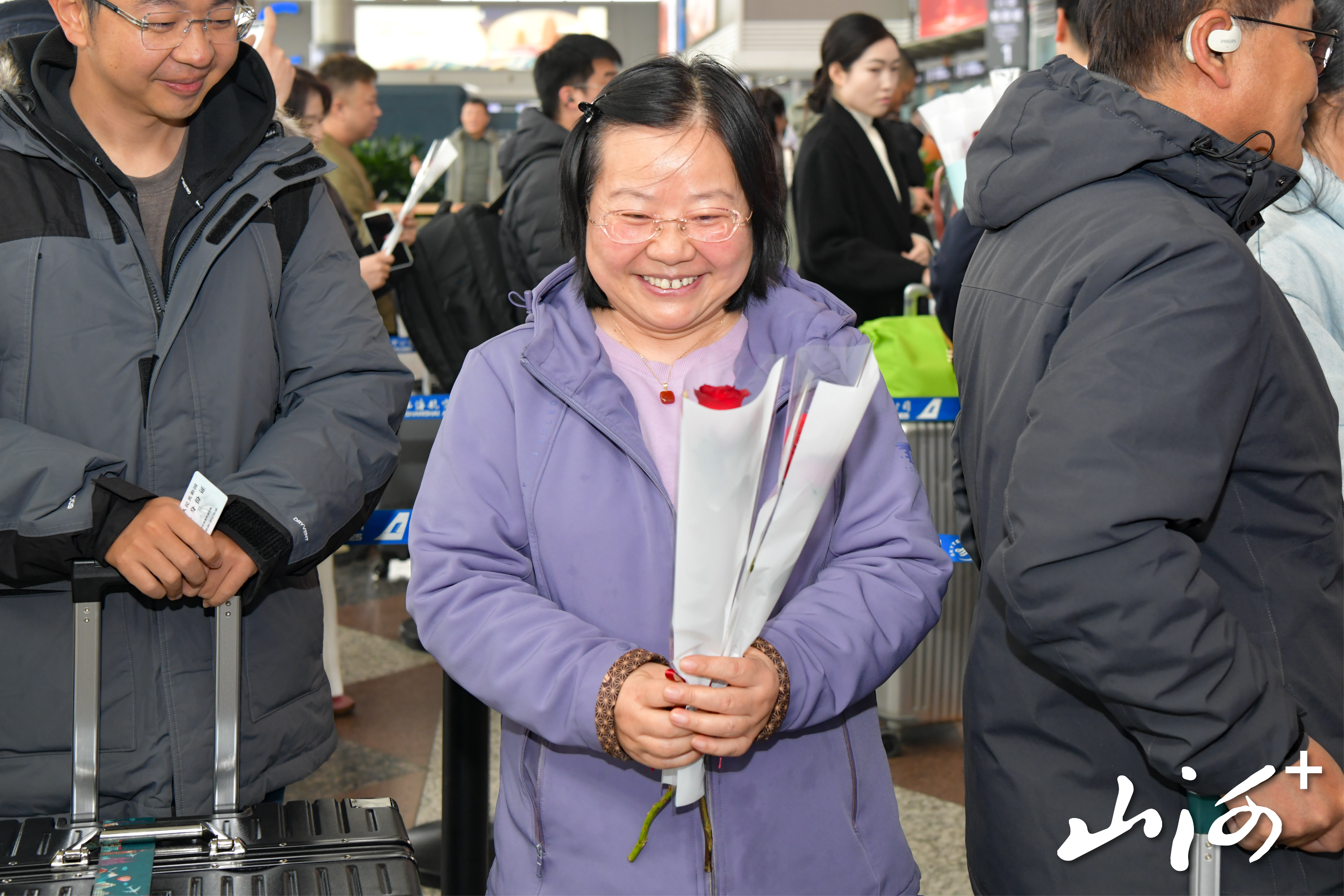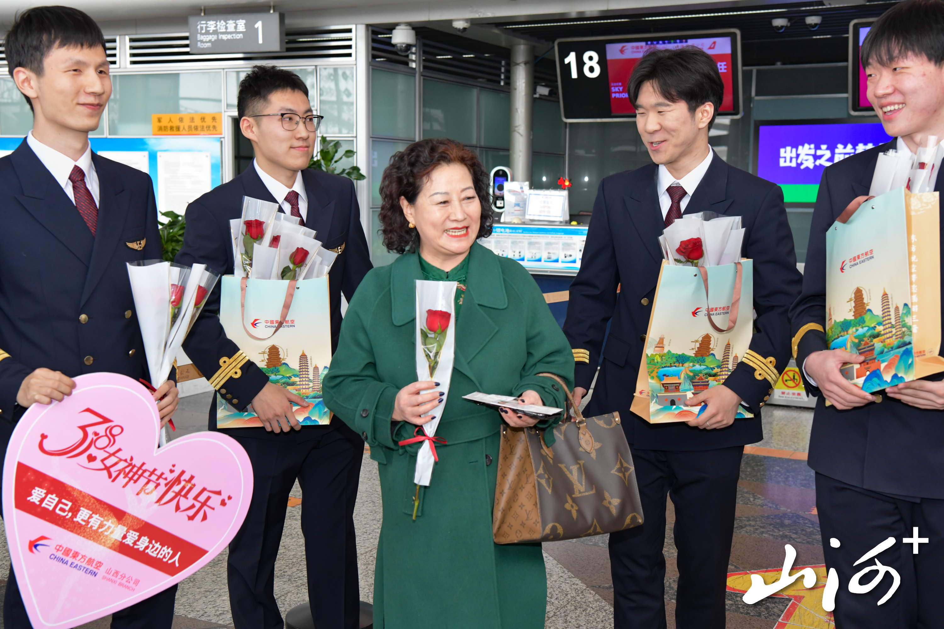 15时许,T2航站楼出发大厅暖意融融。“太惊喜了!”刚踏进候机楼的王女士,从东航飞行员手中接过一支包装精美的红玫瑰,脸上洋溢着惊喜的笑容。今年,东航山西分公司特别组建了由六名飞行员和两名安全员构成的“送花使者团”,他们穿梭于值机柜台、安检通道、候机厅,成为节日里一道流动的风景线。在东航值机区域,飞行员、空中安全员们将玫瑰花递到每一位出行的女性旅客手中,并送上温暖的节日祝福。