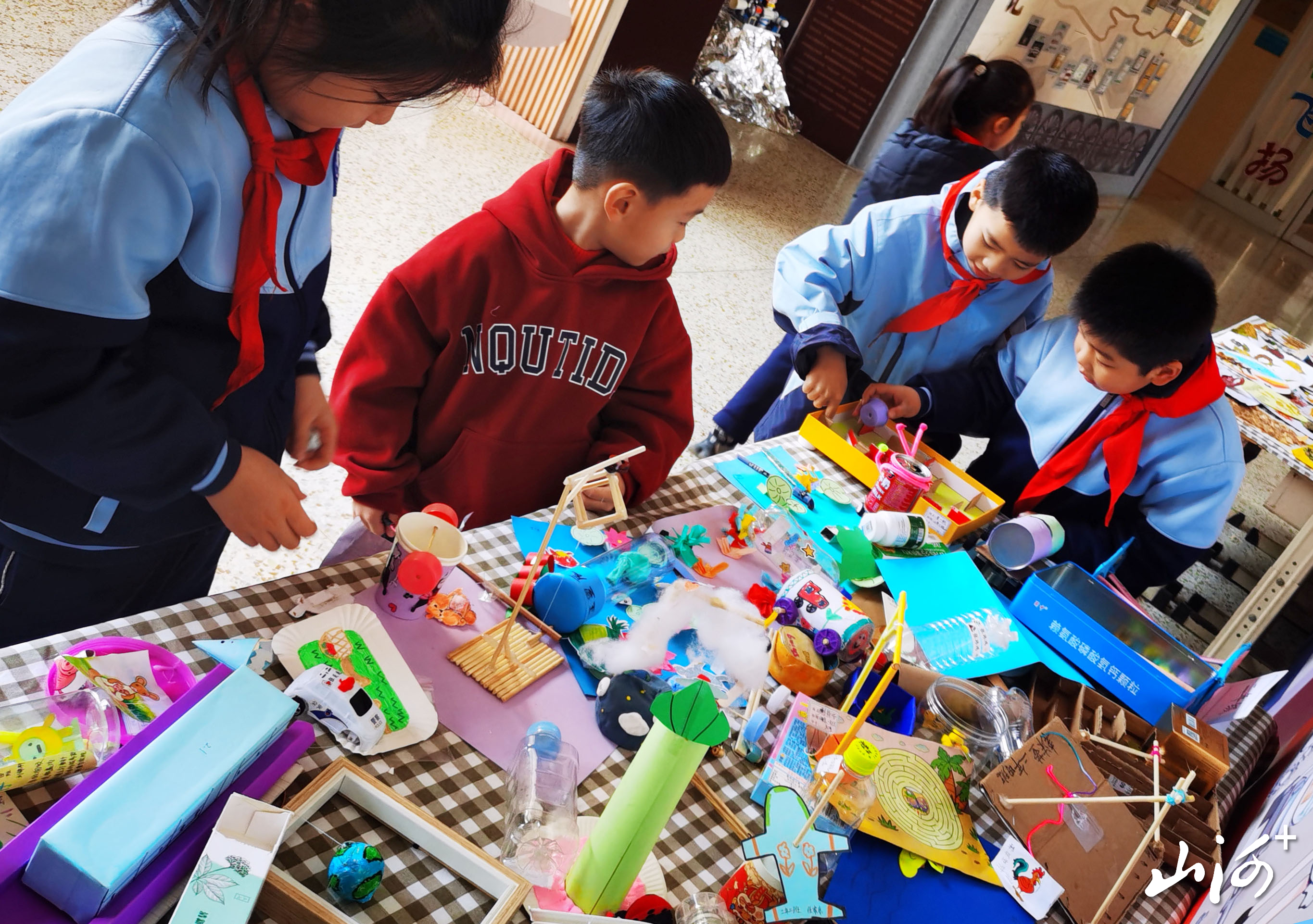 山西晚报·山河+讯 11月27日,太原市迎泽区双塔北路小学的“‘搏·雅’少年科学探索之旅”科技月展览现场,学生们的惊叹与追问此起彼伏。这场以“奇思妙问解决记”为主题的科学展,将教室变成了“迷你实验室”,让课本里的知识“活”了起来。展览现场,废旧纸盒、彩泥、气泡膜等日常材料,被孩子们改造成了八大行星模型、纸火箭、简易潜望镜等20余种作品:用彩泥按比例捏出的木星比地球“大11倍”,还原了太阳系行星的相对大小;纸火箭通过橡皮筋动力实现“反冲飞行”,直观演示了力学原理;星座放映器则借助纸杯和手电筒,把星图投射到墙面上,让星空“搬进”了校园。