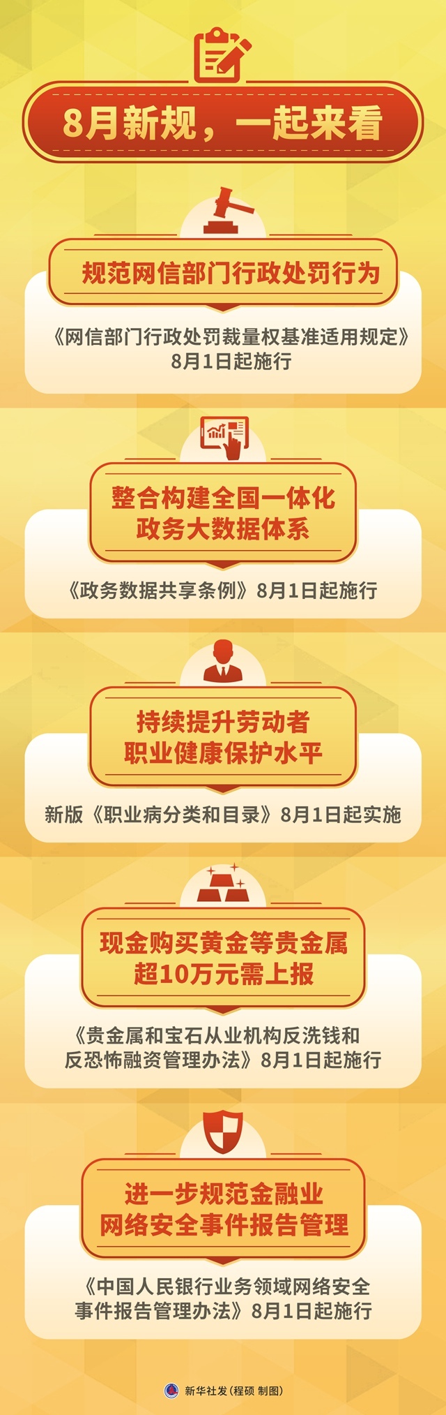 规范网信部门行政处罚行为;整合构建全国一体化政务大数据体系;持续提升劳动者职业健康保护水平……8月一批新规将施行,一起来看!