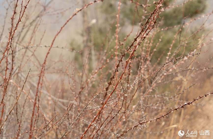 黄刺玫枝条上密布的尖刺粗、密、硬。人民网记者 董童摄