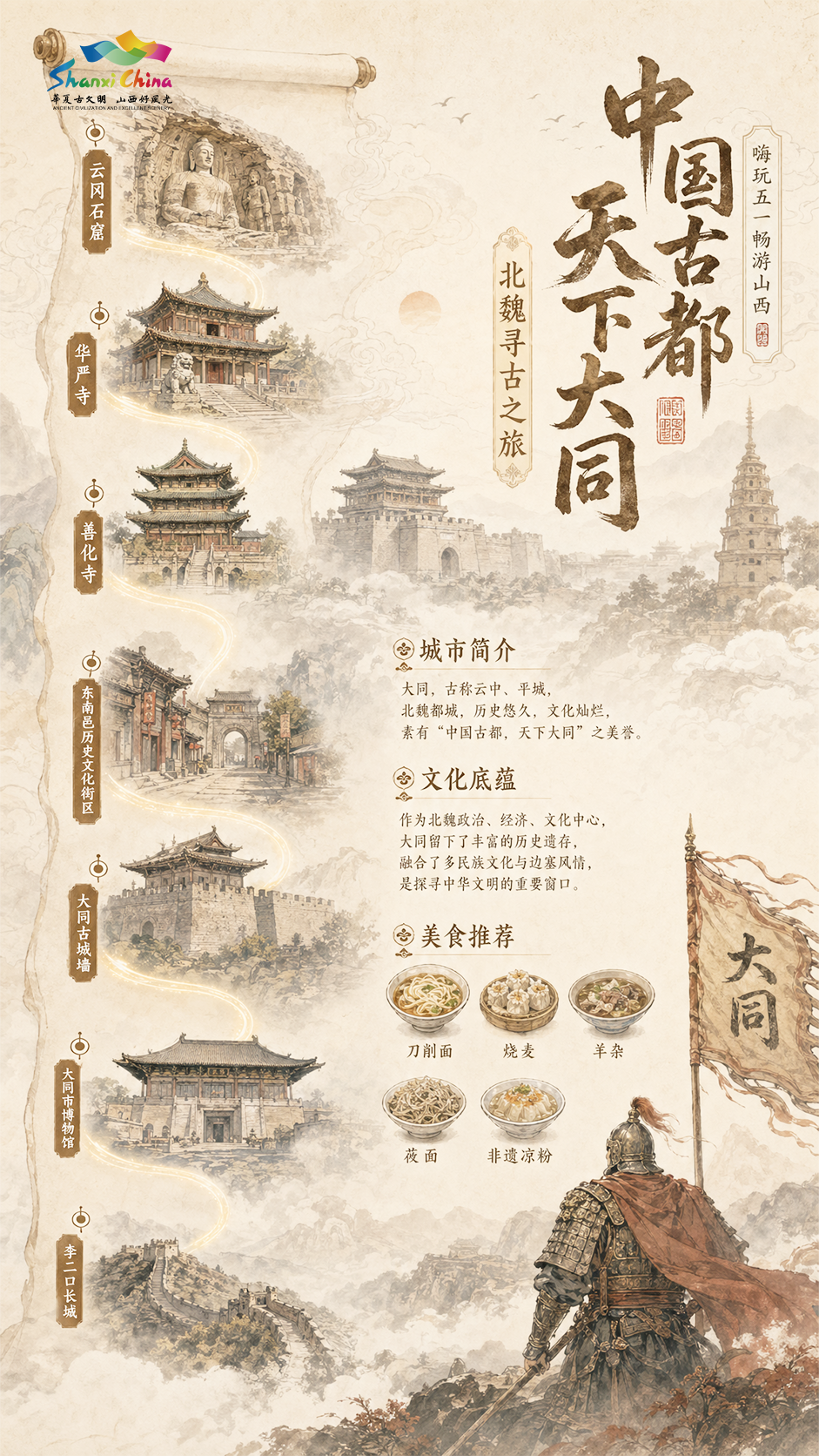 云冈石窟——华严寺——善化寺——东南邑历史文化街区——大同古城墙——大同市博物馆——李二口长城