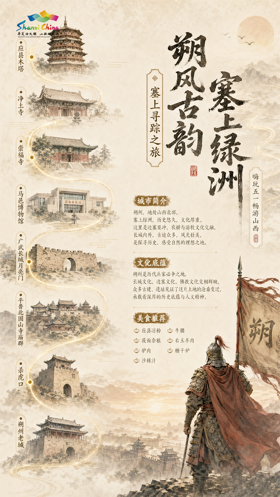 奔赴塞上朔州,一路尽览古建遗韵与边关豪情。仰望千年木塔感受营造匠心,静赏院落中沉淀的岁月清幽,漫步长城古堡触摸边塞历史,在北疆旷野与古建风骨间读懂朔州千年沧桑。