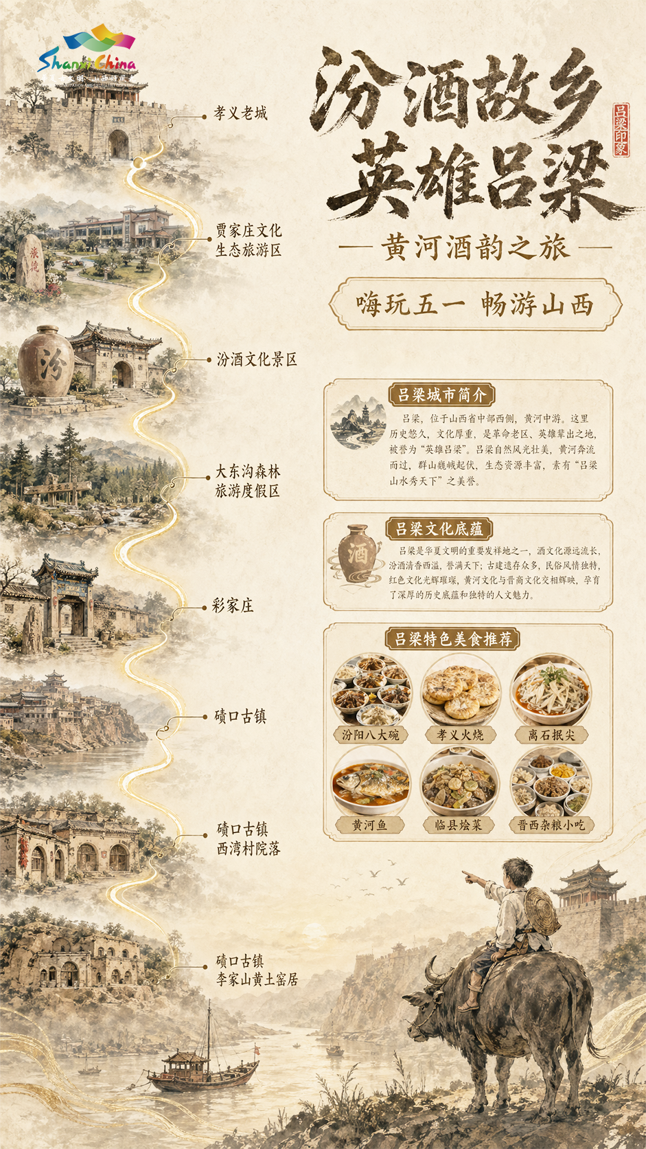 孝义老城——贾家庄文化生态旅游区——汾酒文化景区——大东沟森林旅游度假区——彩家庄——碛口古镇——西湾村——李家山民居