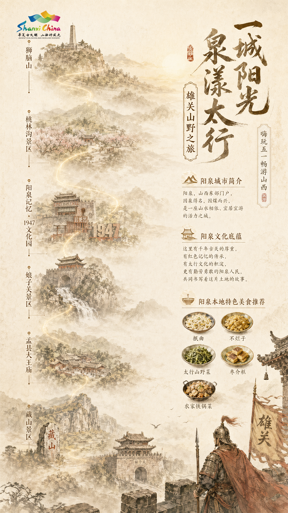狮脑山——桃林沟景区——阳泉记忆·1947文化园——娘子关景区——盂县大王庙——藏山景区