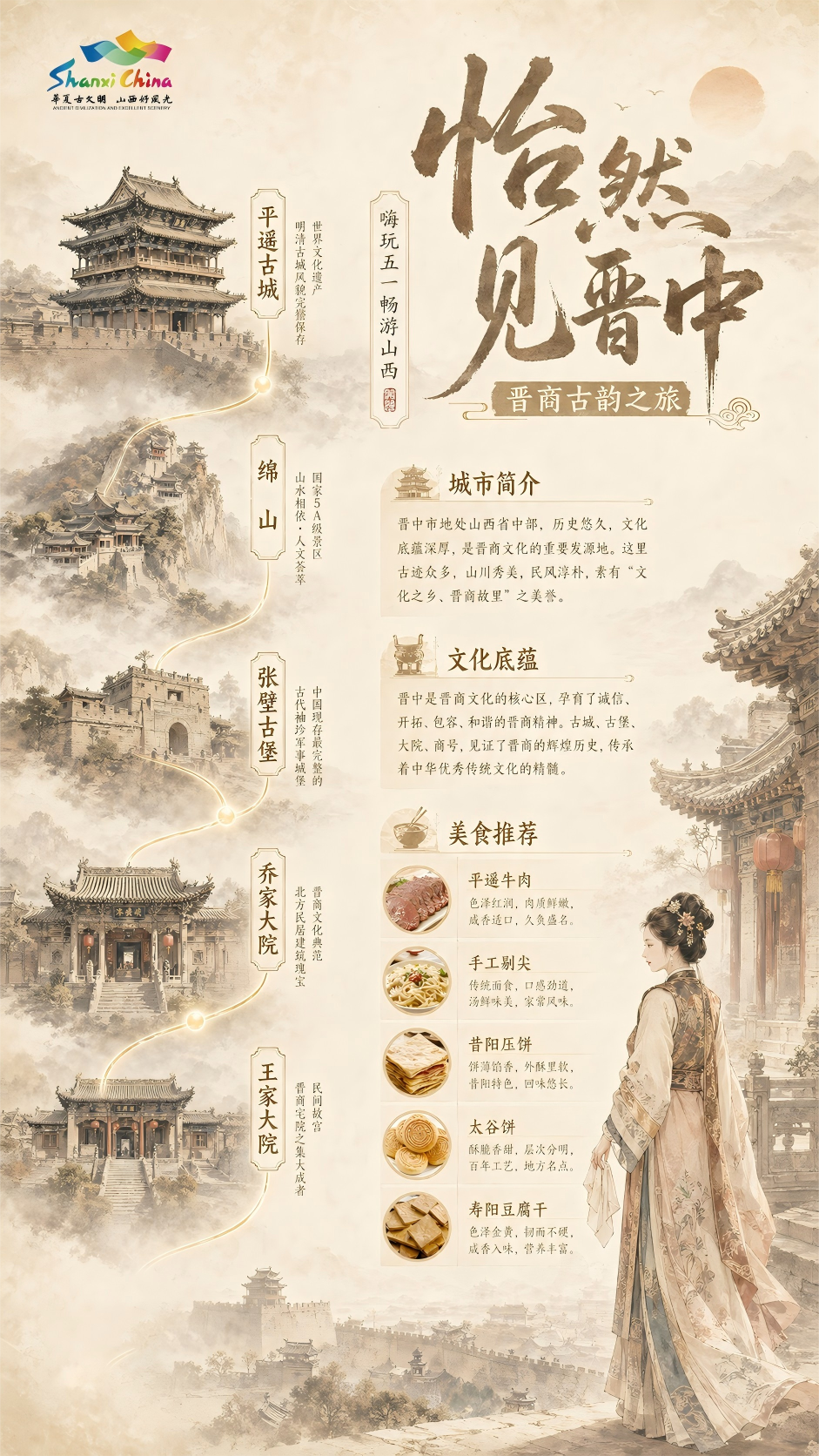 畅游晋商故里,邂逅大院风华与古堡韵味。漫步平遥古城回望旧时商路繁华,探访豪门大院品读晋商传奇,登临太行揽尽山野风光,探秘古堡解锁古寨沧桑,感受晋中独有的晋商底蕴与山河风骨。