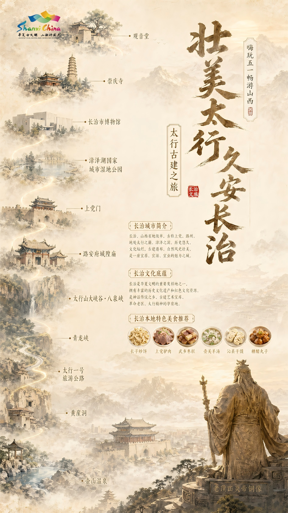 观音堂——崇庆寺——长治市博物馆——漳泽湖国家城市湿地公园——上党门——潞安府城隍庙——太行山大峡谷·八泉峡——青龙峡——太行一号旅游公路——黄崖洞——壶山温泉