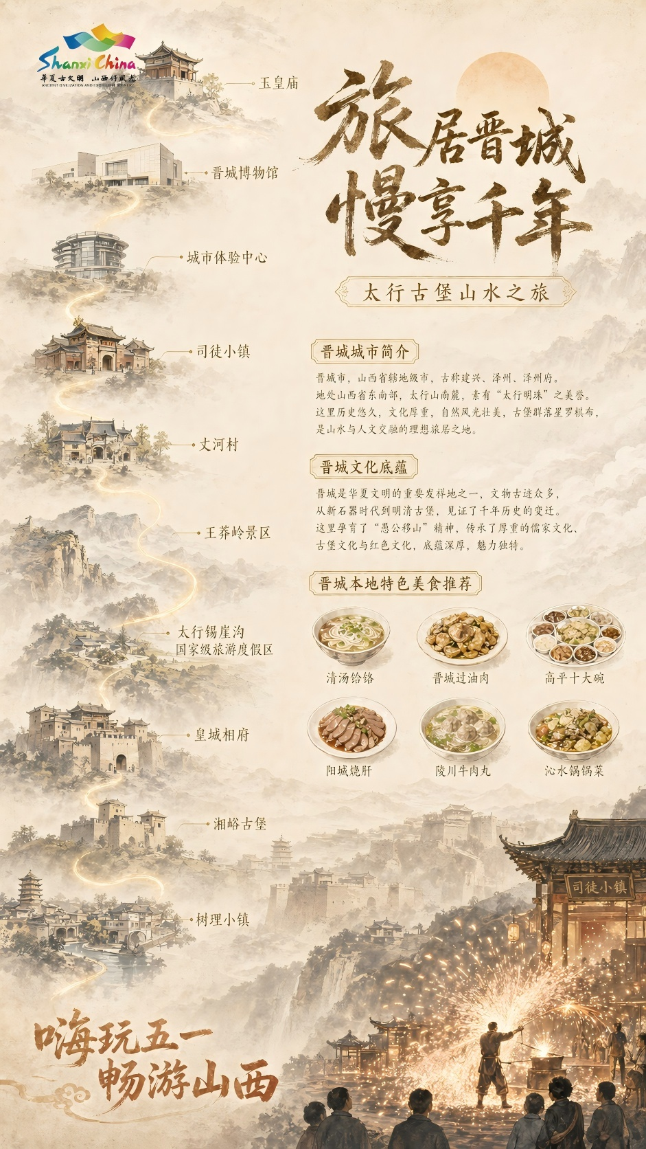 玉皇庙——晋城博物馆——城市体验中心——司徒小镇——丈河村——王莽岭景区——太行锡崖沟国家级旅游度假区——皇城相府——湘峪古堡——树理小镇