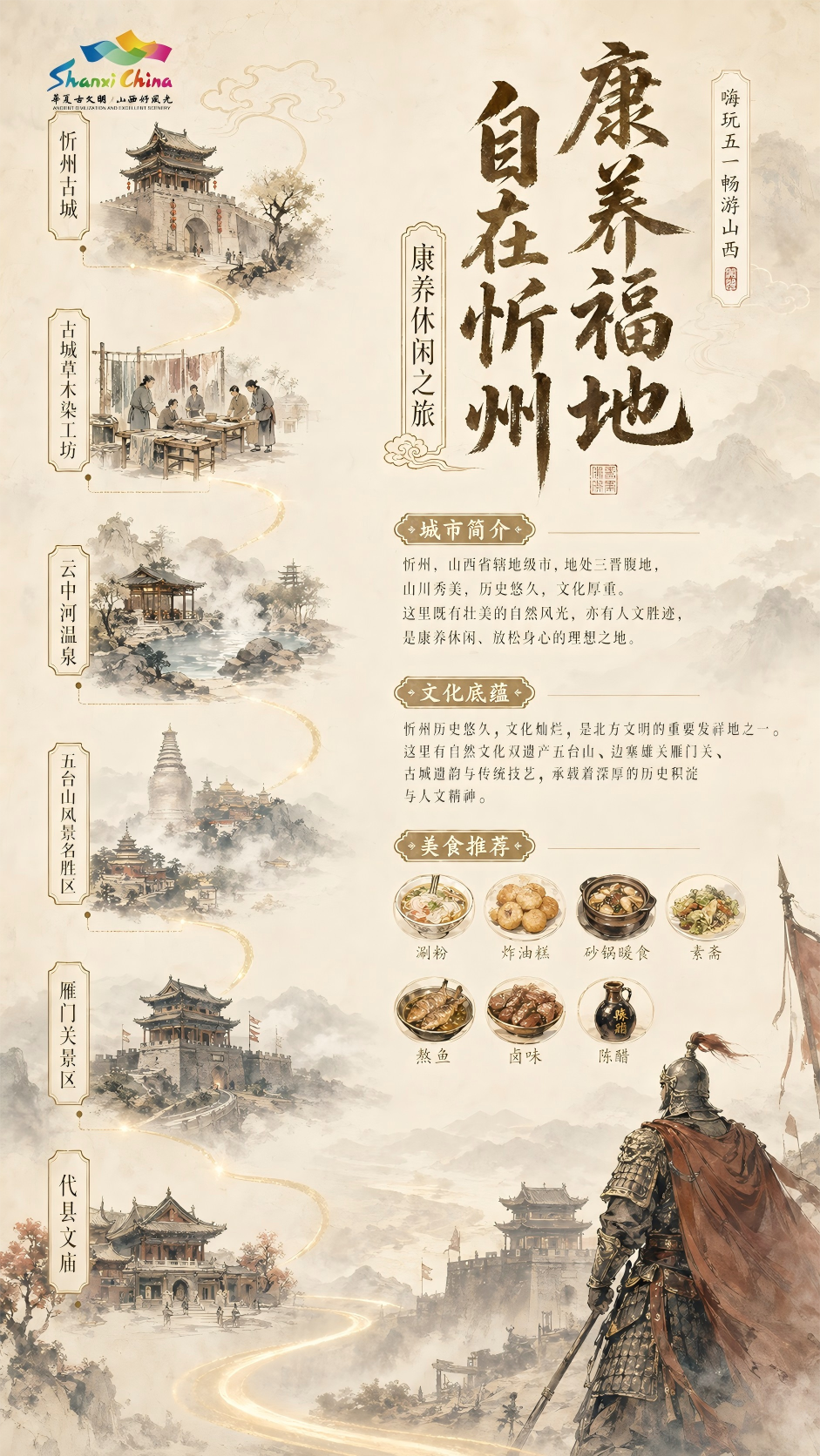 此路线既涵盖了古城慢生活的温柔闲适,又藏着地道市井气息与非遗人文底蕴。一边是山林清幽的景色,一边是边塞雄关的豪迈,在动静相宜的节奏里,感受忻州文武共生、松弛治愈的旅行氛围。