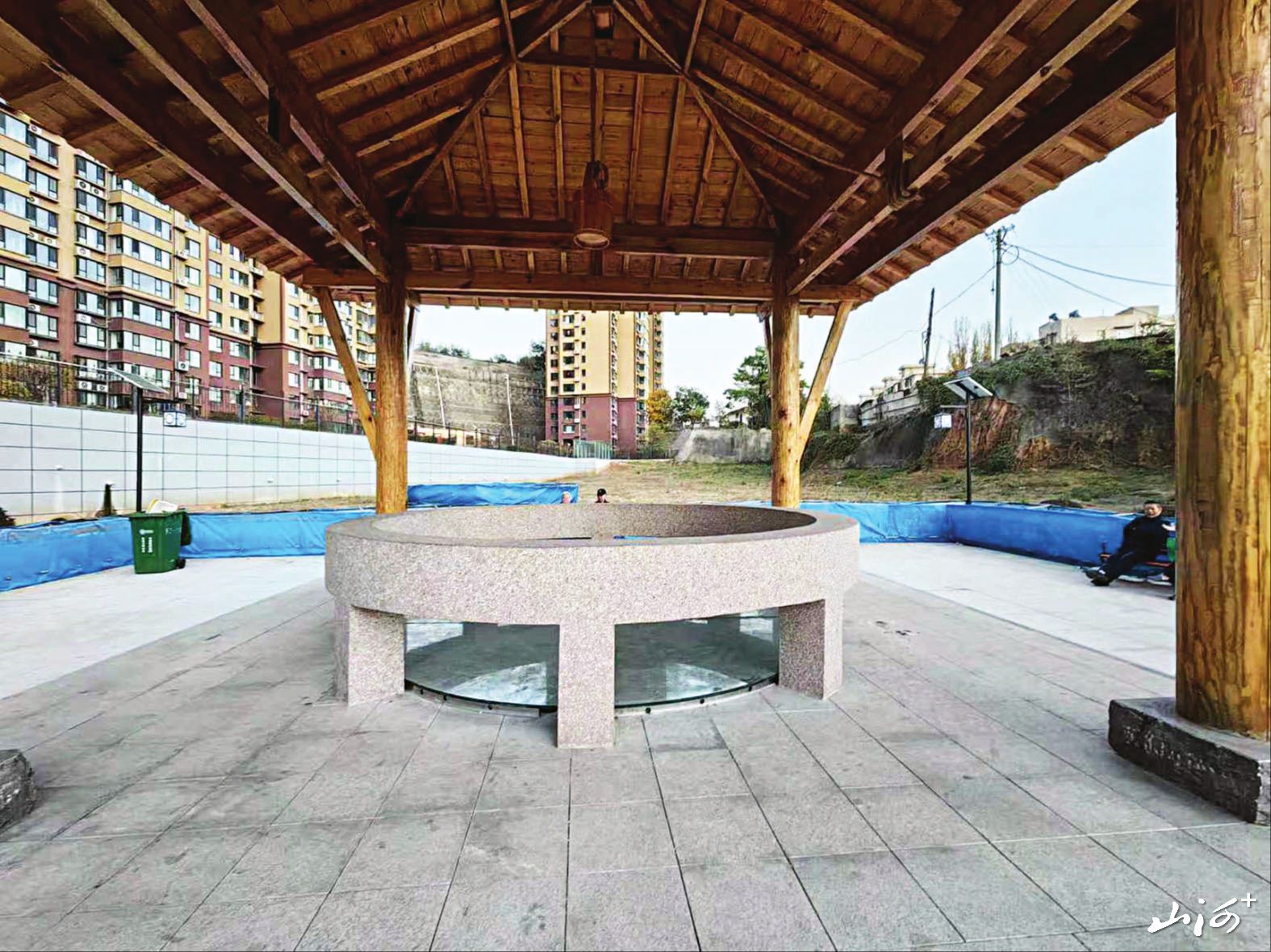 为了更好地保护和活化古井,阳泉市政府以文物保护及活化利用为主题,建设了展示性“口袋公园”——平坦垴古井公园。公园占地面积约2.8亩,集古井文化展示与休闲游憩功能于一体,于2025年8月建设完工,9月8日正式对外开放。公园围绕全国现存最大、最完整的战国木构水井平坦垴古井遗址建设,设置了古井亭、文化展示牌、题字石等元素,配套建设景观步道、绿化植被及休闲广场。设计遵循省文物部门指导意见,采用浅根系植物保护遗址区,并补充落叶乔木形成季节景观变化。该项目不仅优化了周边人居环境,为居民提供便捷的休闲空间,而且通过文化符号将古井这一两千多年前的智慧结晶进行解读,是科学处理经济建设和文物保护关系的典型案例。
