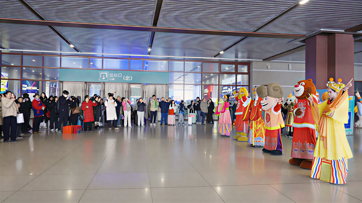 活动现场,身着节日盛装的十二生肖萌偶与熊出没明星列队迎宾,憨态可掬的模样瞬间成为出站口焦点,引得过往旅客纷纷驻足,拿出手机拍照留念。随着返乡客流陆续抵达,欢快的旋律骤然响起,“生肖天团”与熊出没家族共同跳起萌趣舞蹈,将热烈的节日氛围直接拉满。