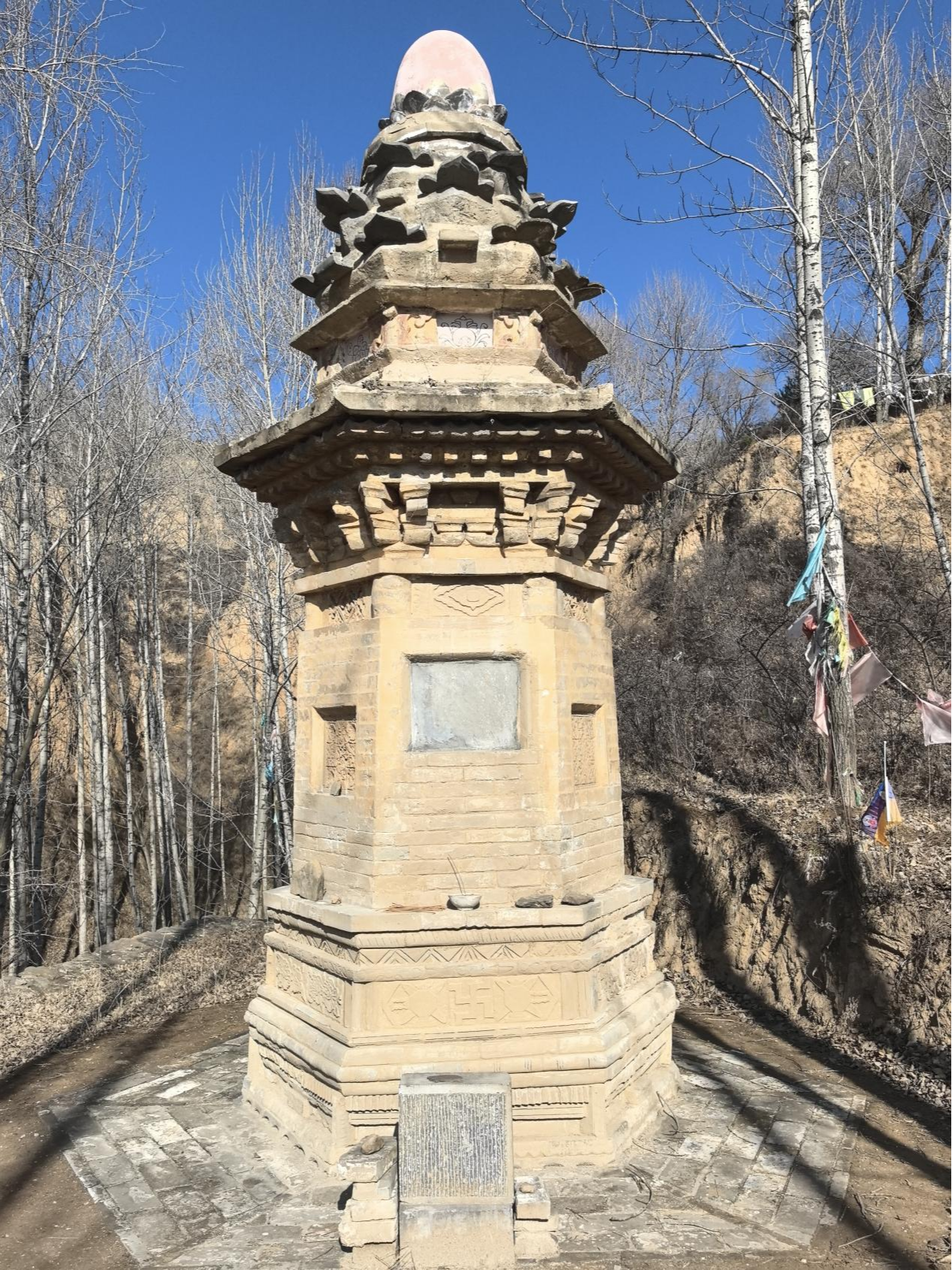 寺沟金墓塔位于五台县东会村寺沟小组东南约300米处。该塔坐北朝南,为单檐实心砖塔,平面呈六边形,自下而上分为须弥座塔基、收分塔身、砖仿木塔檐、山花蕉叶塔刹四部分。须弥座塔基分13层,下部以砖叠涩、阴线线条装饰为主,较为朴素,上部壸门柱子、罨涩部位砖雕“卍”字纹和花卉、莲瓣等图案,较为繁缛,须弥座六面一式,整体风格较为古拙。塔身南侧遗有砖额,或为镶贴石碣之处;东南侧及西南侧正中设花窗,窗分九格,格心雕十字花;其余三面为素面。塔身上部出砖仿木额枋、圆柱头,柱间“卍”字纹和旋花隔面砖雕,南侧为旋花造型。塔檐下为五铺作砖雕斗栱,不设补间,转角铺作共计6朵。砖雕斗栱之上出砖椽、砖檐,其上再设四层溜肩叠涩。塔刹塔檐之上设六边形束腰基座,基座之上砖砍磨仰莲瓣三层。寺沟金墓塔位于寺沟村朝阳寺后山中,承载和记述了许多历史的故事,也凝结了许多古老的智慧和勤劳,是当地人的骄傲和文明的见证,具有很高的文化价值与情感价值。