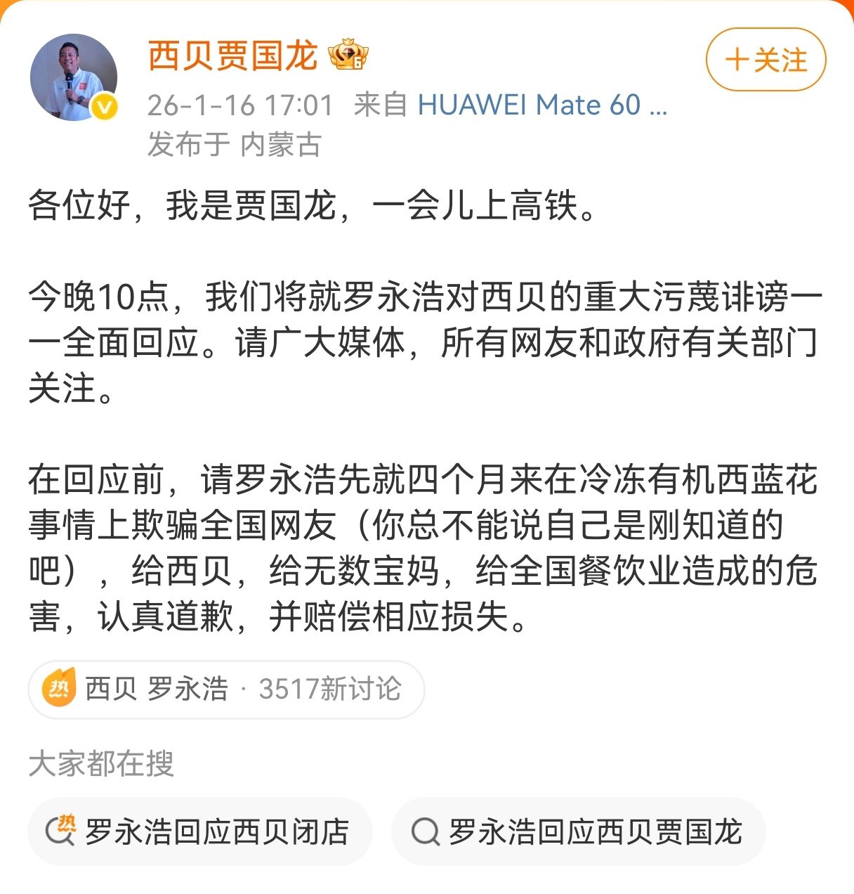 1月16日,西贝贾国龙在微博上发文:将就罗永浩对西贝的重大污蔑诽谤全面回应,微博全文如下。