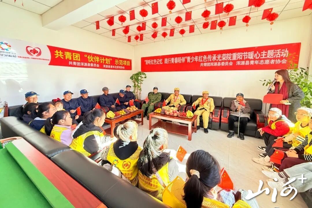 山西晚报·山河+讯 重阳敬老情意浓,红色传承映初心。重阳节前夕,10月26日,由共青团浑源县委员会指导,浑源县青年志愿者协会依托2025年共青团“伙伴计划”示范项目——“伙伴领航站”在浑源县光荣院举办“聆听红色记忆 践行青春陪伴”重阳节主题活动。来自辖区思源社区的30余名青少年,与光荣院的11位革命老前辈共度佳节。