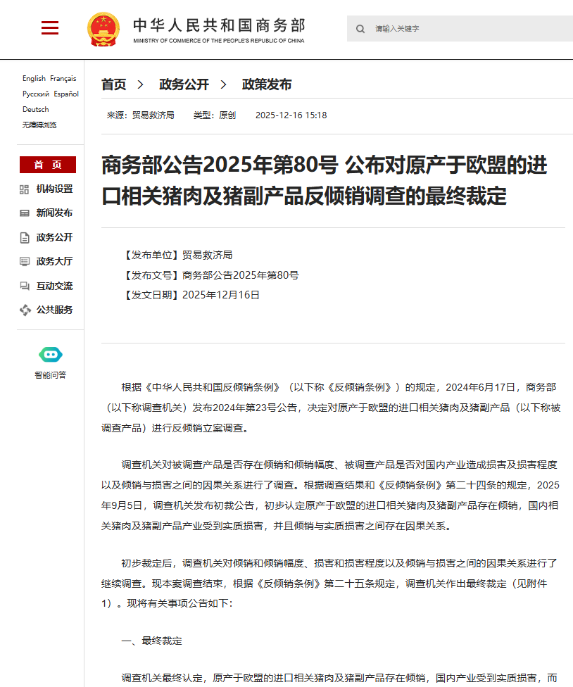 商务部公告2025年第80号 公布对原产于欧盟的进口相关猪肉及猪副产品反倾销调查的最终裁定