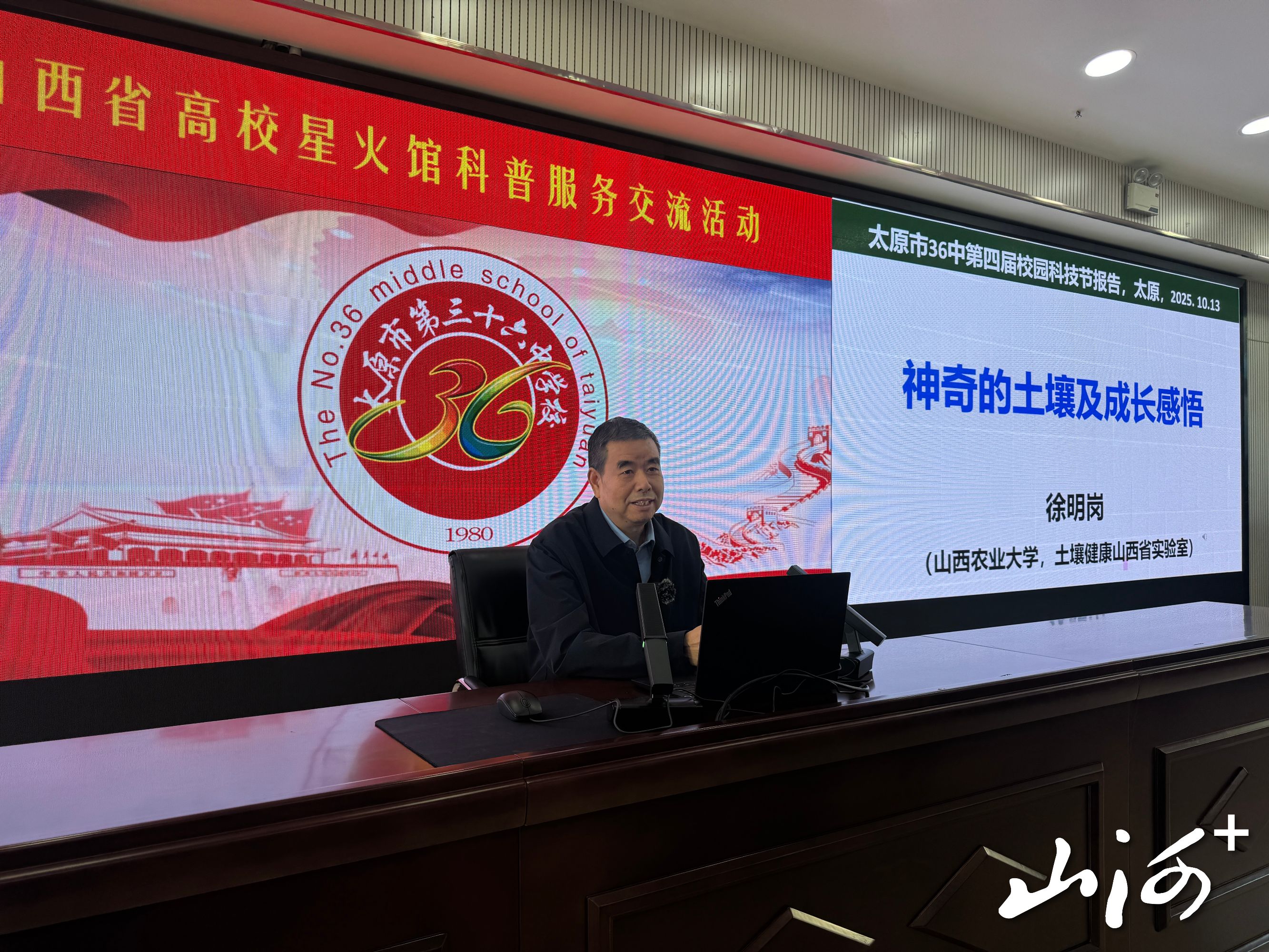 开幕式伊始,省科协刘晓舟部长致辞,太原市科协、省青少年科技教育工作者协会为太原三十六中授“科技创新普及校”“山西省科技辅导员培育基地”牌。该校特聘科学副校长屈非为市青少年科技创新大赛一等奖学生颁奖,并寄语“以今日之‘奇思妙问’,铸明日之科学栋梁”。随后,中国工程院徐明岗院士以《神奇的土壤及成长感悟》开讲,从“土壤”切入,用通俗语言拆解科研逻辑,提炼“坚守梦想”“持之以恒”“勤于实践”科研素养,叮嘱学生“多观察、多记录”。互动环节中,徐院士针对“秸秆处理”“土壤碳库”等问题答疑,鼓励学生用知识分析现实难题。