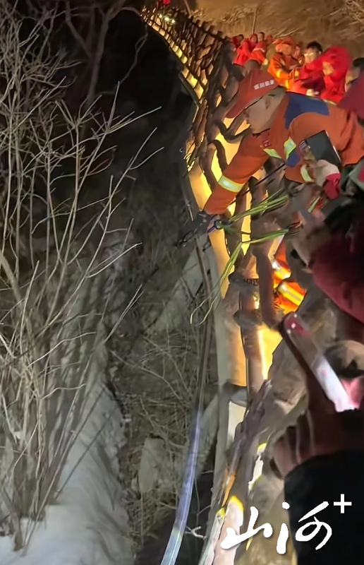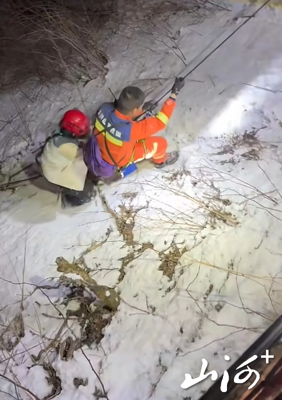 19日21时40分,救援队接到派出所求助后,迅速派出11名队员携带专业装备赶赴现场。在主峰北侧栈道下方搜寻时,队员们发现崖底传来微弱的手电光——正是被困女子发出的求救信号。经定位,其位置距栈道垂直高度约130米,崖壁陡峭且覆盖积雪,救援难度极大。