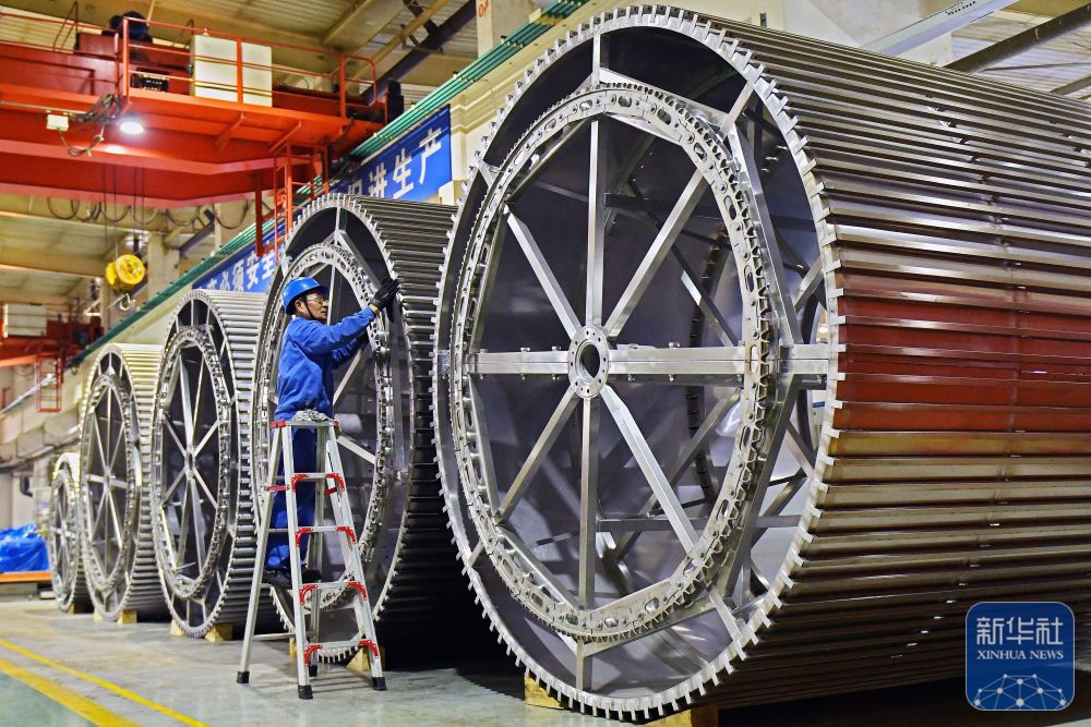 ↑ 2月24日,在江苏省连云港经济技术开发区重山风电设备公司车间,工人在生产风电塔架。新华社发(王健民摄)