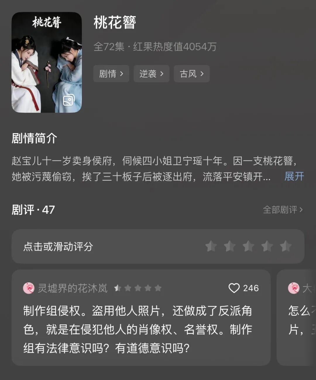 3月30日晚,有网友在社交平台发帖指控,红果短剧平台上的作品《桃花簪》未经本人允许擅自使用其照片,通过AI技术生成剧中角色,还将其丑化为猥琐好色的负面形象。