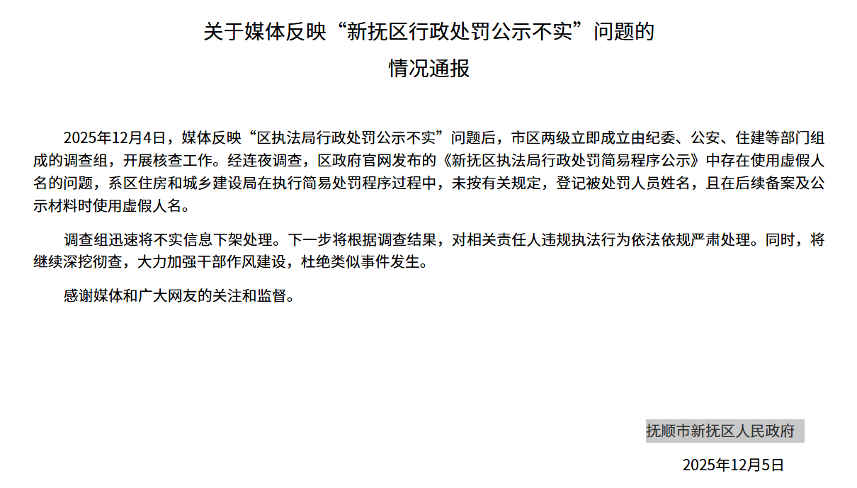 据抚顺市新抚区人民政府官网12月5日发布的情况通报:经连夜调查,该公示中存在使用虚假人名的问题,系区住房和城乡建设局在执行简易处罚程序过程中,未按有关规定登记被处罚人员姓名,且在后续备案及公示材料时使用虚假人名。