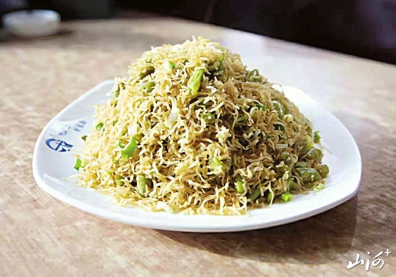 以焖白面丝炒制而成,酥软鲜香,面香浓郁。
