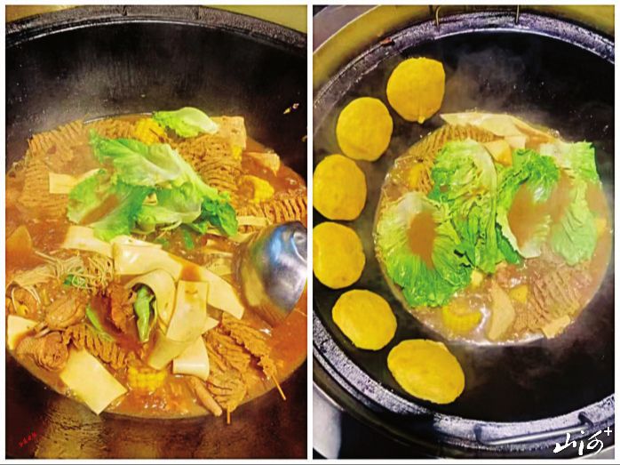 以猪骨汤、羊杂熬制而成,微辣香咸。