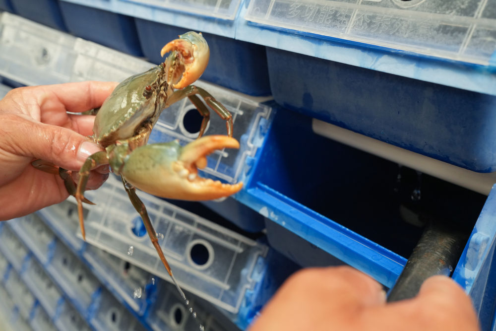 2025年9月2日,在浙江省宁海县一市镇的一家青蟹生产企业,工作人员在暂储青蟹的“蟹公寓”中查看其健康状态。新华社记者 翁忻旸 摄