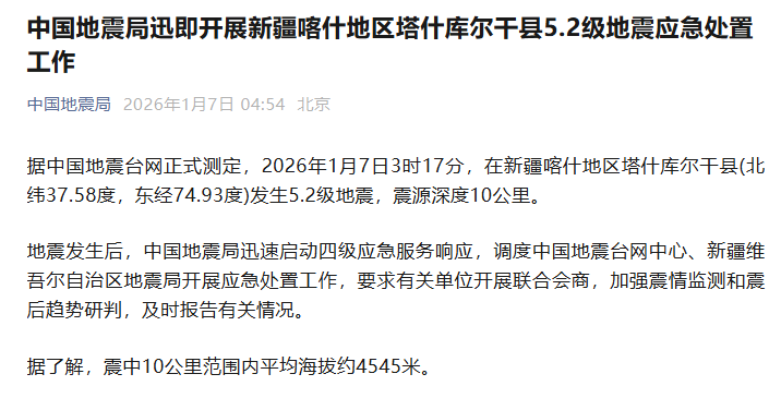 据中国地震台网正式测定,2026年1月7日3时17分,在新疆喀什地区塔什库尔干县(北纬37.58度,东经74.93度)发生5.2级地震,震源深度10公里。