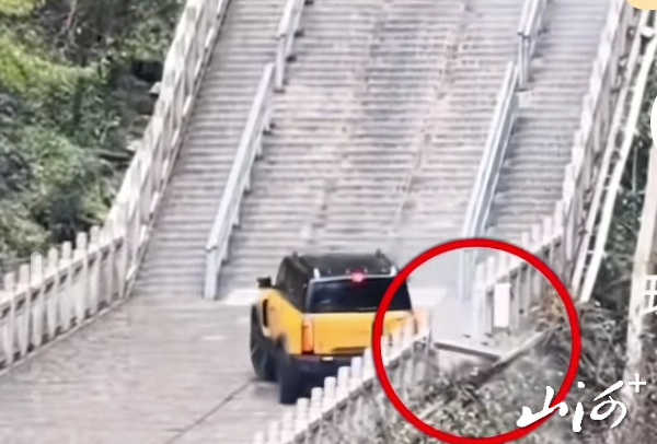 网友拍摄的视频显示,一辆黄色的车辆猛踩油门攀爬至半坡位置时,车轮突然打滑,随后车辆失控径直向后倒退,在倒退过程中撞上护栏,导致部分建筑受损。据目击者称,事发于当天中午,涉事车辆爬台阶未能成功,将护栏撞开了一个口子,“后来停在那里两个小时没动”。