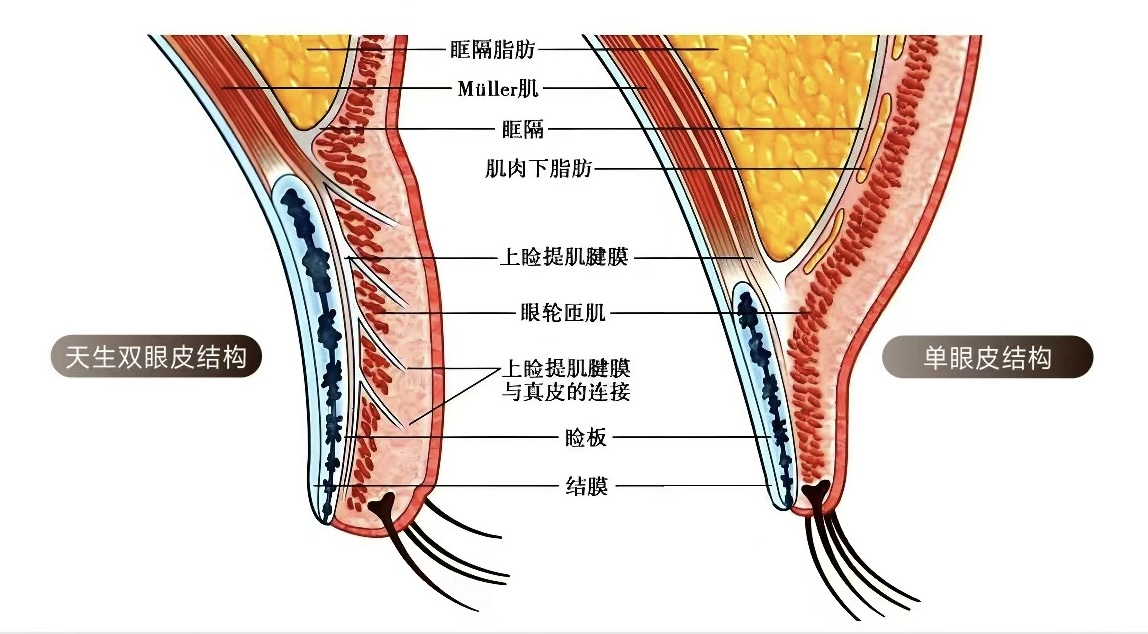 重睑皱襞(双眼皮)的形成与上睑提肌腱膜及其发出纤维的附着有密切关系以及与单眼皮的区别见图三。上睑提肌腱膜的大部分纤维附着于睑板上缘并延伸到睑板前中、下1/3交界处;腱膜深部的部分纤维穿过 Müller氏肌,止于结膜上穹窿;腱膜的外侧角附着于眶外侧结节和外眦韧带上缘,内侧角附着于额泪缝和内眦韧带上缘;还有一部分纤维束向前下方穿过眼轮匝肌止于睑板前皮肤,而这部分纤维与重睑皱襞的形成关系最为密切见图三。