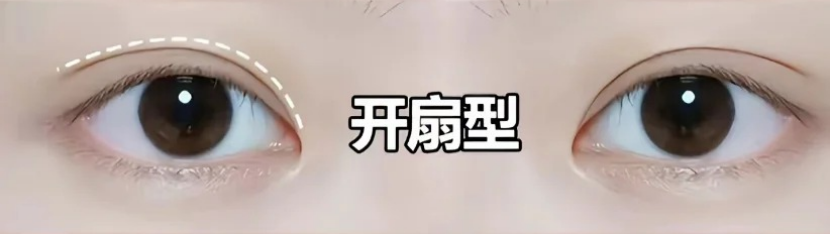 1.开扇形:双眼皮的皱褶线起于内眼角皮肤缘之内,内眼角处看不到双眼皮约3~5mm。很多天生双眼皮属于此类,也称妈生款双眼皮,适合大多数人。