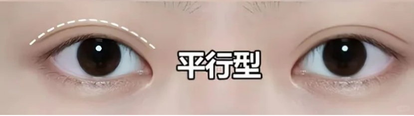 3.平行型:双眼皮皱褶线也是顺着内眼角皮缘外出来,但从内到外呈一样的宽度。也称欧式双眼皮,对化妆及有上镜需求者可考虑。