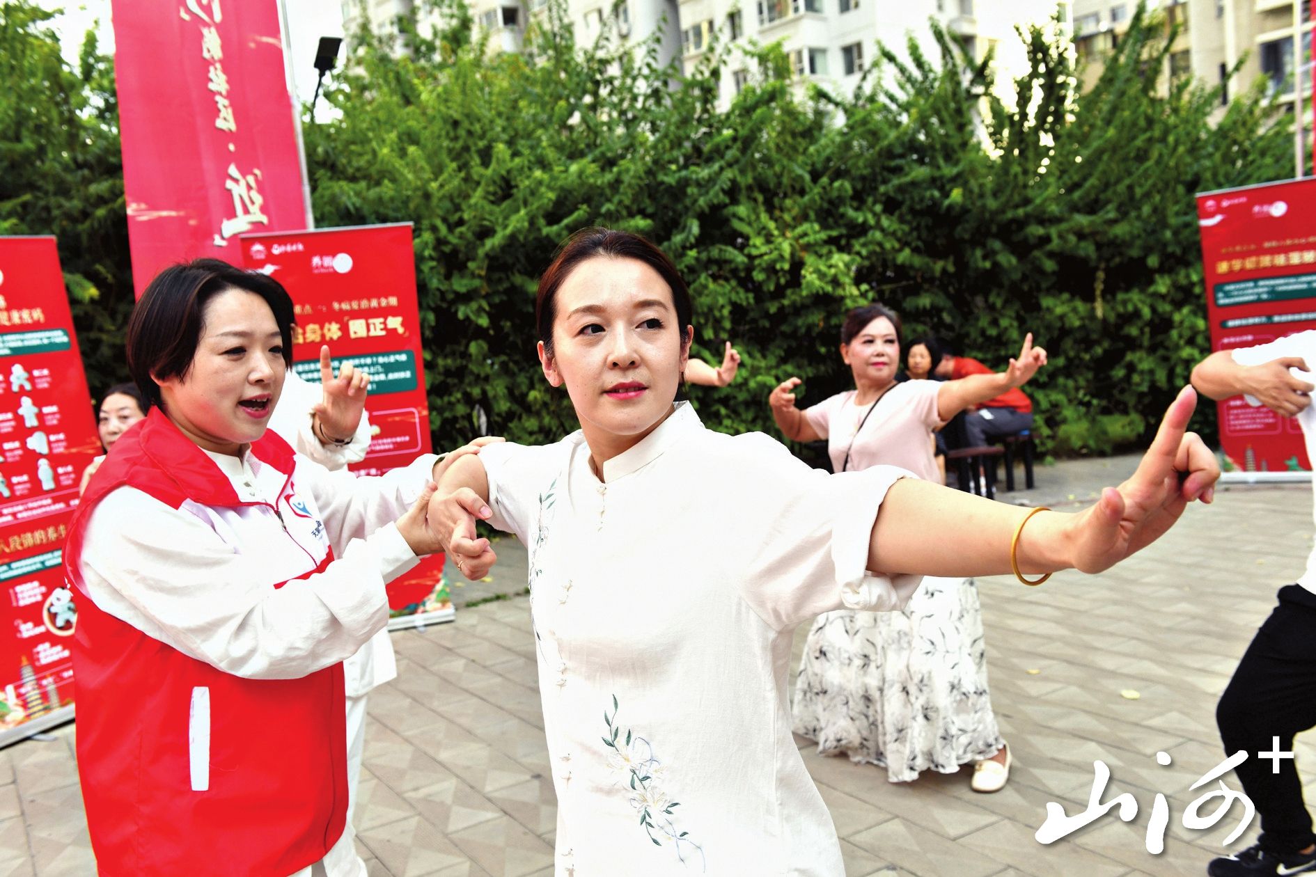 同时,学习的过程中,居民们也个个精神饱满,并跟随着张雯的口令认真学习,时而抬手伸臂,时而转腰屈膝,在舒缓的音乐中舒展筋骨。
