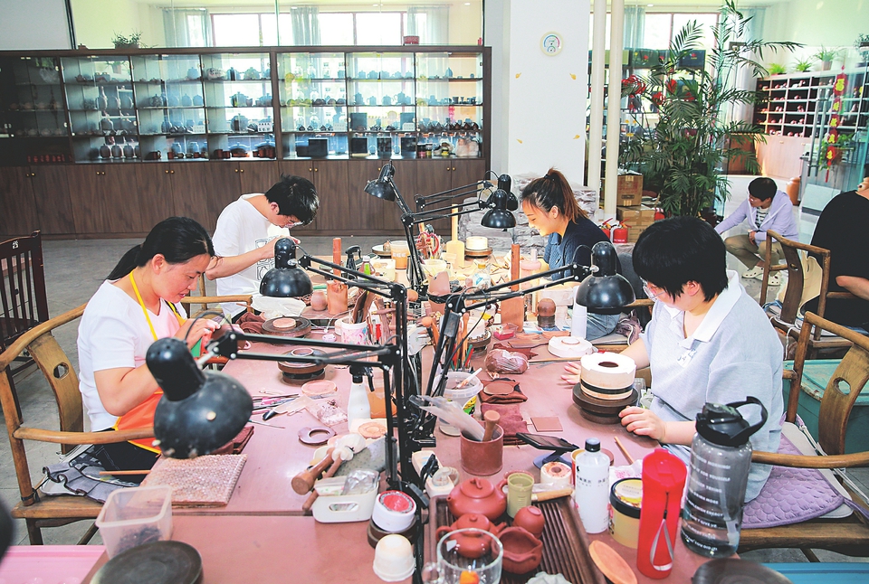 工艺师们正在制作紫砂壶。