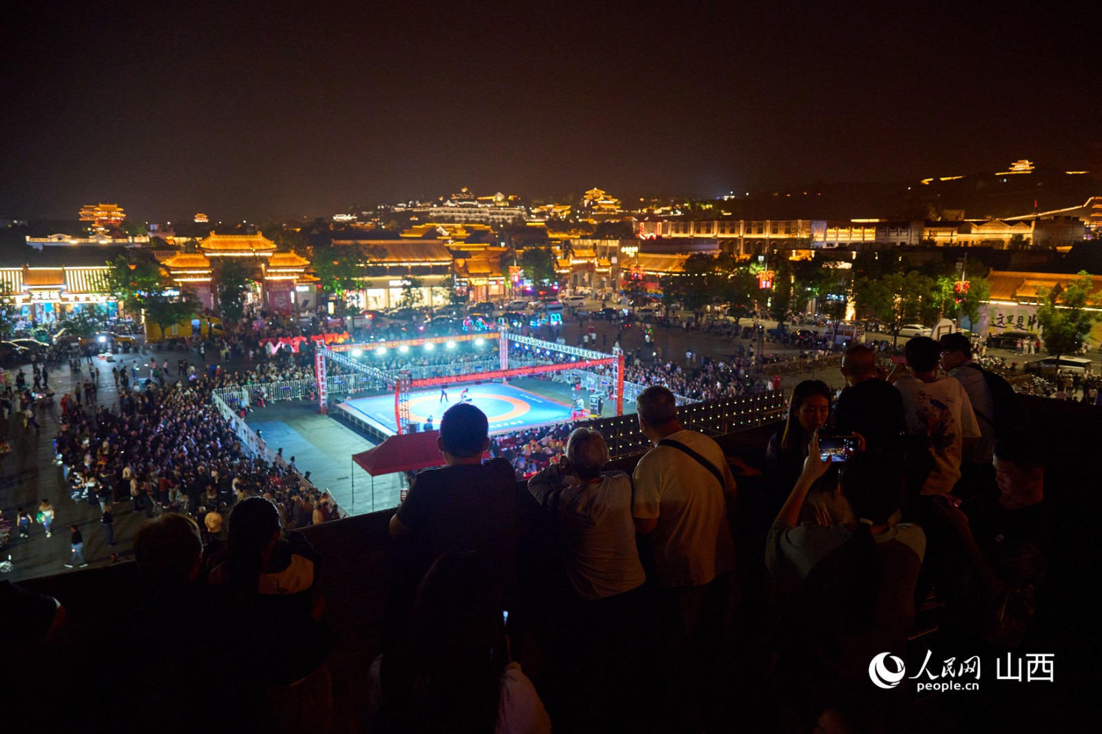 游客们在忻州古城城墙上观看对抗挠羊赛。人民网 张超宁 摄